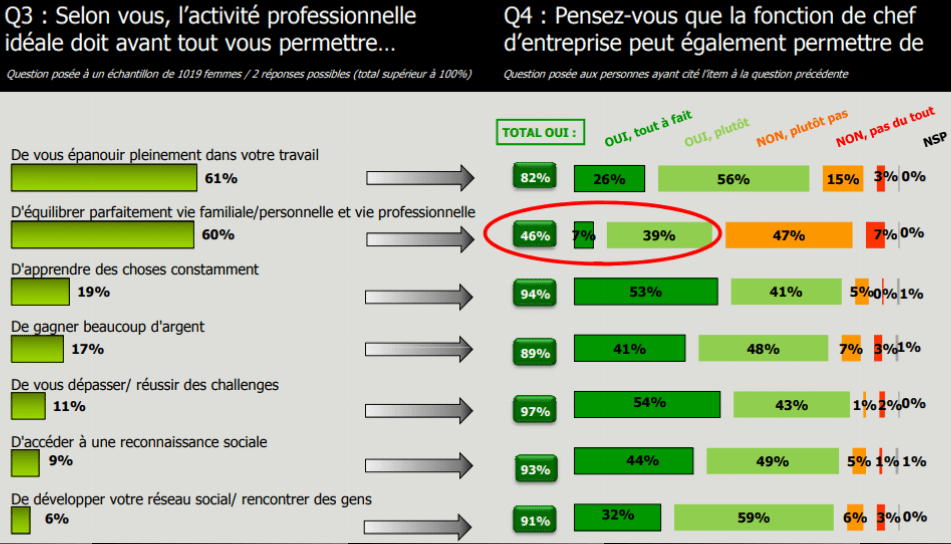 En effet, les notions d’épanouissement personnel et d’équilibre entre vie privée et vie professionnelle apparaissent clairement comme des facteurs déclencheurs de la prise de décision d’entreprendre. Pour plus de 2 femmes sur 3, la création d’entreprise est plus épanouissante que le salariat. Et 60% des femmes sondées pensent que devenir chef d’entreprise permet de trouver un équilibre entre vie de famille et carrière professionnelle. On remarque donc que pour les femmes, à contrario des hommes, le but d’entreprendre est avant tout d’être heureuses et de s’accomplir personnellement et professionnellement (51% pour les femmes ; 45% pour les hommes) plutôt qu’une motivation pour gagner plus! (27% contre 37% pour les hommes).